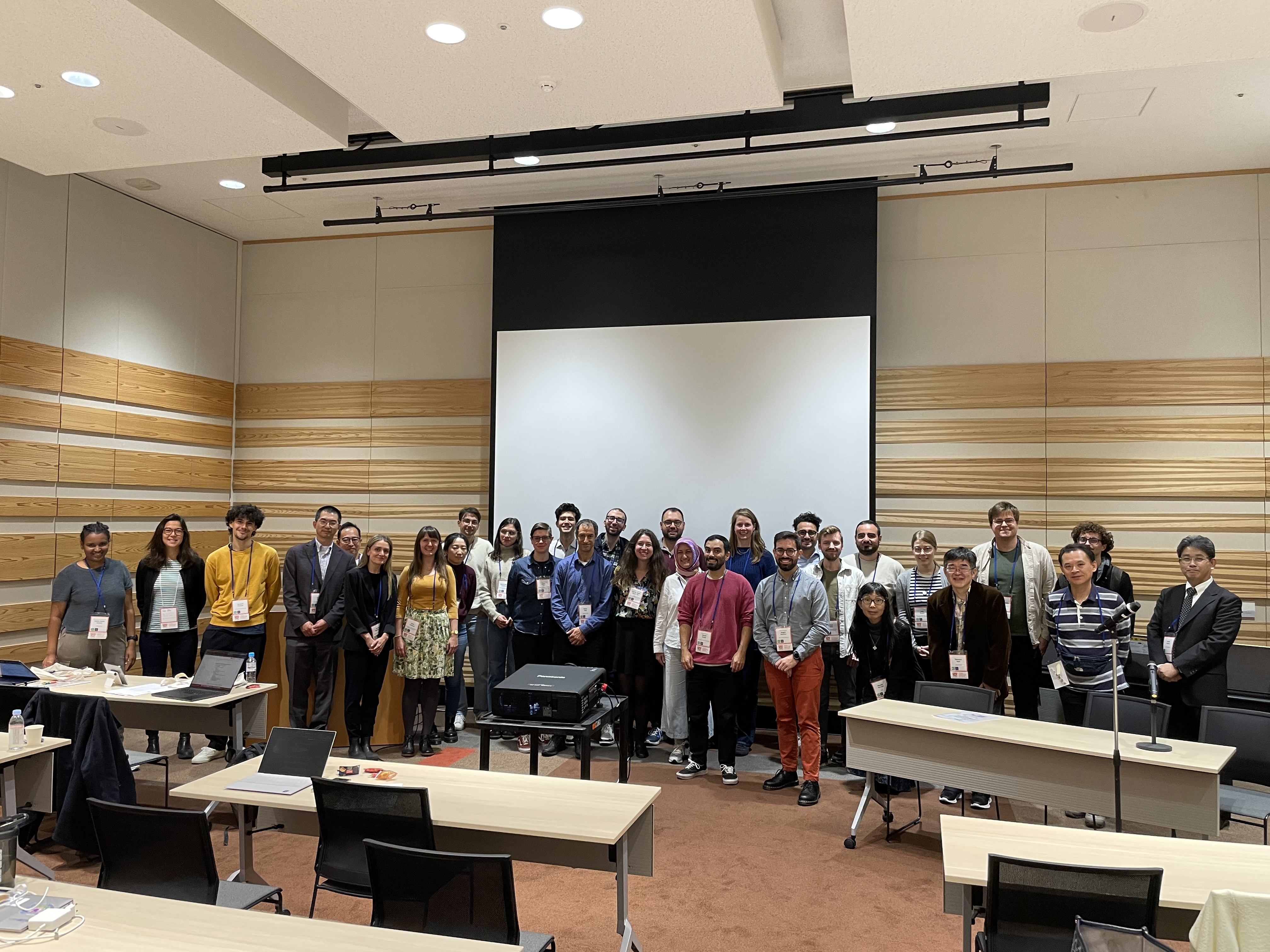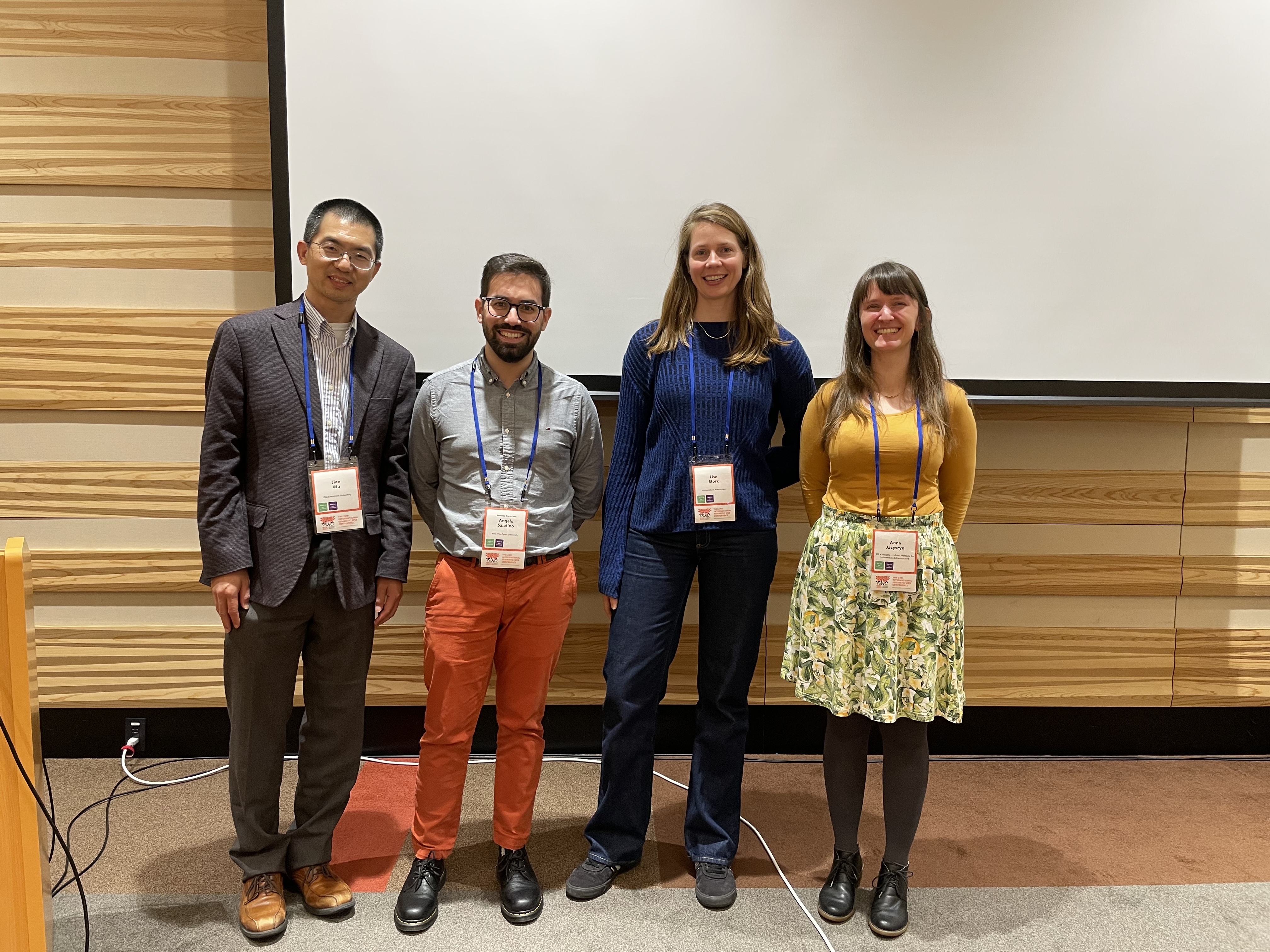 Pictures shot at the workshop. On the left, the attending organisers (Angelo, Lise, and Anna) with Jian Wu (keynote spearker). On the right, the audience.